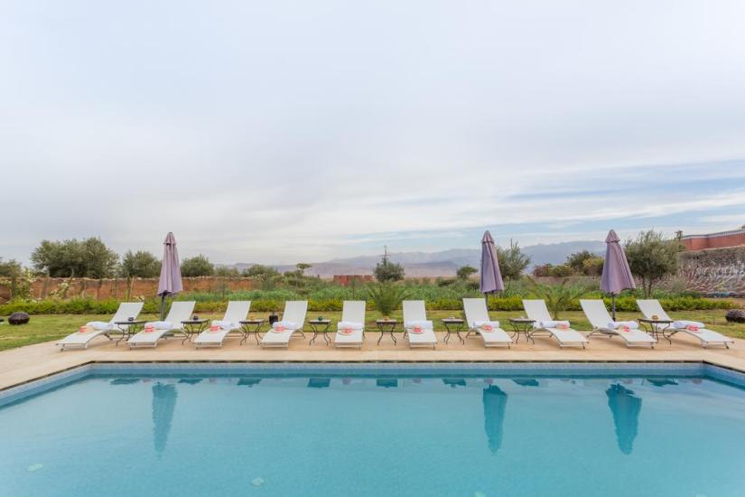 A beautiful boutique-style guesthouse, situated at the foothills of the High Atlas Mountains in a quaint rural setting. Offers magnificent views across the Atlas Mountains and the countryside Berber villages gleam in the background. At Jnanat Aicha you will find an oasis of peace to rejuvenate and relax. Breathing the fresh unpolluted air of the mountains, enjoying beautiful uninterrupted scenery of the Atlas countryside, expect courteous accommodation and personalised service. Travelling guests are welcomed to a stylish and colourful holiday retreat with all the modern conveniences such as high-speed internet access, flat-screen Cable TV / radio, AC & Heating and outdoor swimming pool.